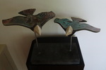 20142 Vliegende vogels raku gestookt. De vogels zijn met kant bewerkt. De glazuur is kobaltblauw en metalic. Ze staan op pinnen in een zwart raku blok.