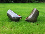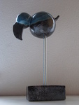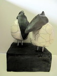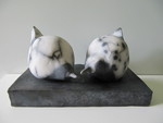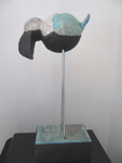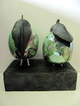 20152 vreemde vogels in de Raku techniek. De glazuur is groen/blau oxide, dit geeft veel keur scharkeringen. De vogels zitten samen op een zwart plateau. 1 vogel 'praat', de andere luistert.