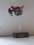 20152 vreemde vogels in de Kopermat techniek. De vogels zijn rijk van kleur (o.a. roze, paars, blauw, geel) met zwart. Samen staan ze op een zwart keramiek plateau. 1 vogel 'praat', de ander luistert.
