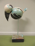 2011Toekan, raku gestookt, meerkleurig op keramiek sokkel. Kan allen in combinatie met Toekan, rakugestookt 2 wprden gekocht.