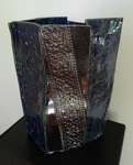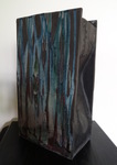 2014Van 5 plakken gemaakte 'vaas', raku gestookt. De grote, gladde plakken zijn met 2 verschillende glazuren bewerkt. De smalle, gebogen plakken zijn zwart, met kant bewerkt.