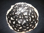 2014Half ronde 'vaas', raku gestookt. De platte voorkant is met kant en glazuur bewerkt. De Zwart, half ronde achterkant is met dezelfde kant bewerkt.