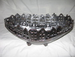 2014Bol schaal met afrukken van breiwerkstukken verwerkt op de schaal. De stukken met afdrukken van breiwerk zijn 'gescheurd' op de schaal verwerkt. De buitenkant van de schaal is zwart spiegelglazuur de binnenkant en de breiwerken zijn mat glans naturel.