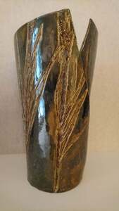2022A-symetrische vaas waarin grassen zijn afgedrukt. De buitenkant is brons, de grassen amber. De binnenkant is hoogglans zwart/goud.