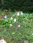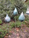 20113 druppels, raku gestookt, in aqua, groen en zwart. De druppels staan op ijzeren staven in de grond. De aangegeven maten zijn per druppel, exclusief de staaf.